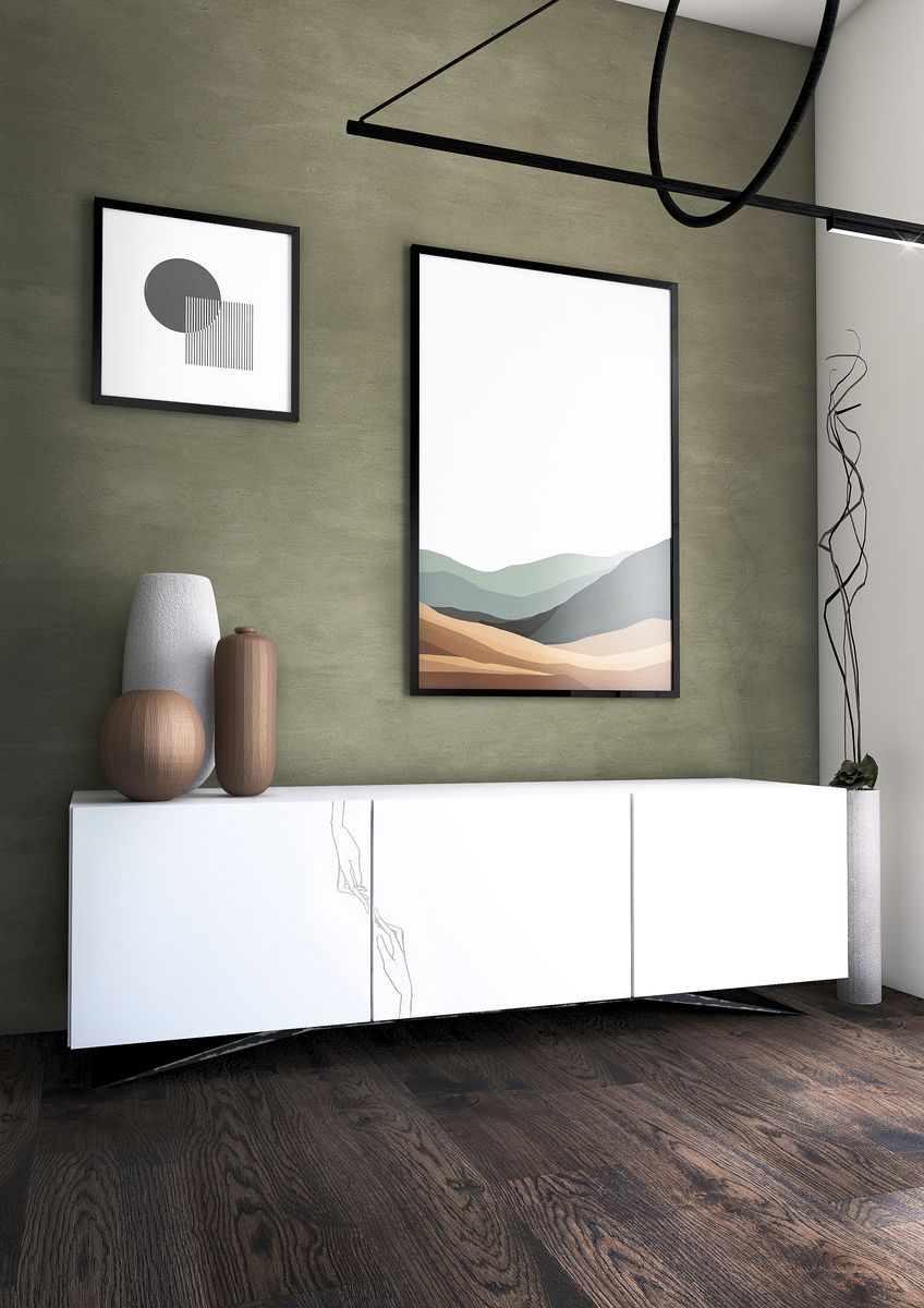 Un design pulito che combina materiali moderni con la tradizionale lavorazione del legno, questa credenza presenta una grafica tipica della collezione in edizione limitata, questo sofisticato pezzo di design contemporaneo si distingue per la sua base curva in ferro che sostiene un piano in laminato laccato bianco. Le ante sono dotate di apertura push-pull.