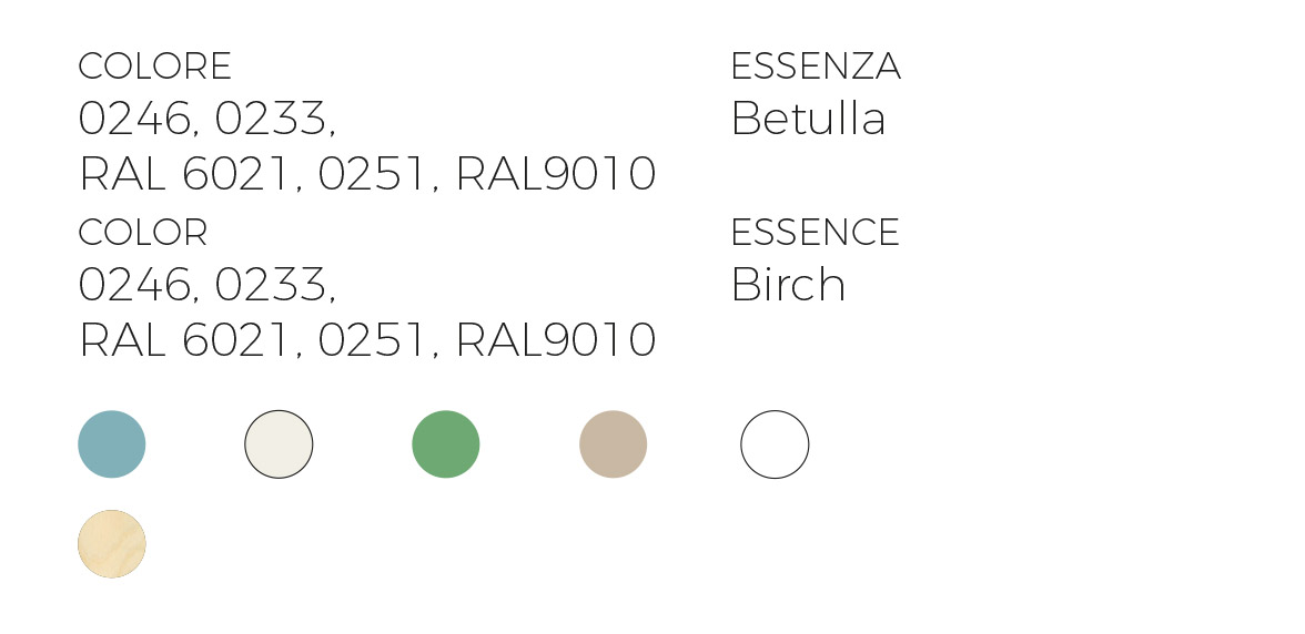 COLORE 0246, 0233, RAL 6021, 0251, RAL9010 ESSENZA Betulla