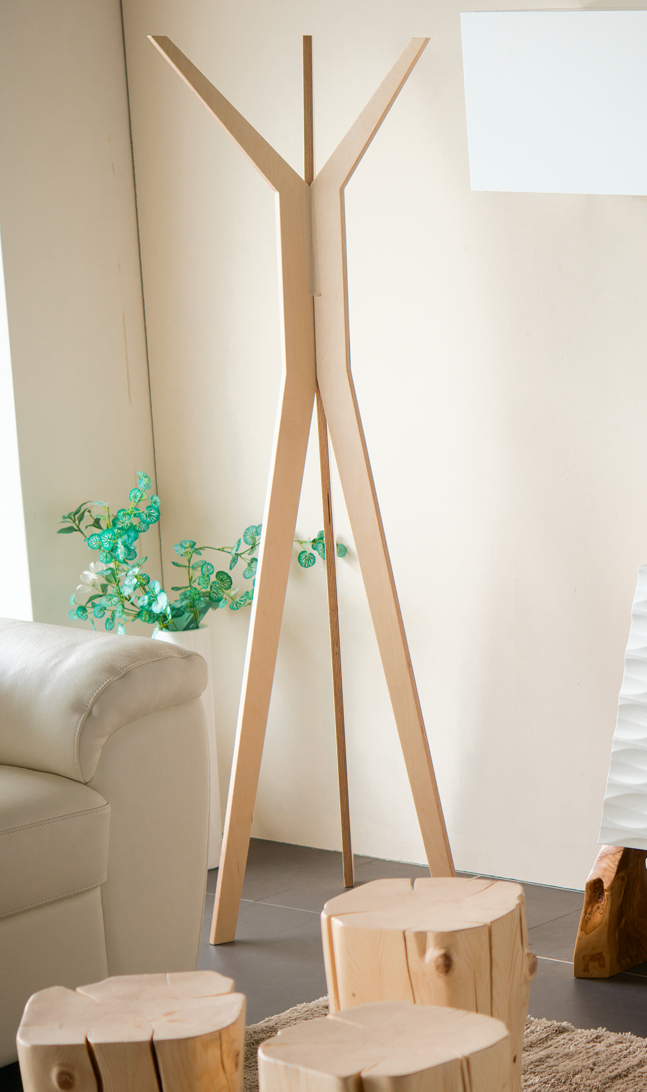 Appendiabiti in multistrato di betulla composto da 3 bracci di diversa inclinazione, con o senza punte laccate DIMENSIONI L 460 x P 460 mm x H 1680 mm
